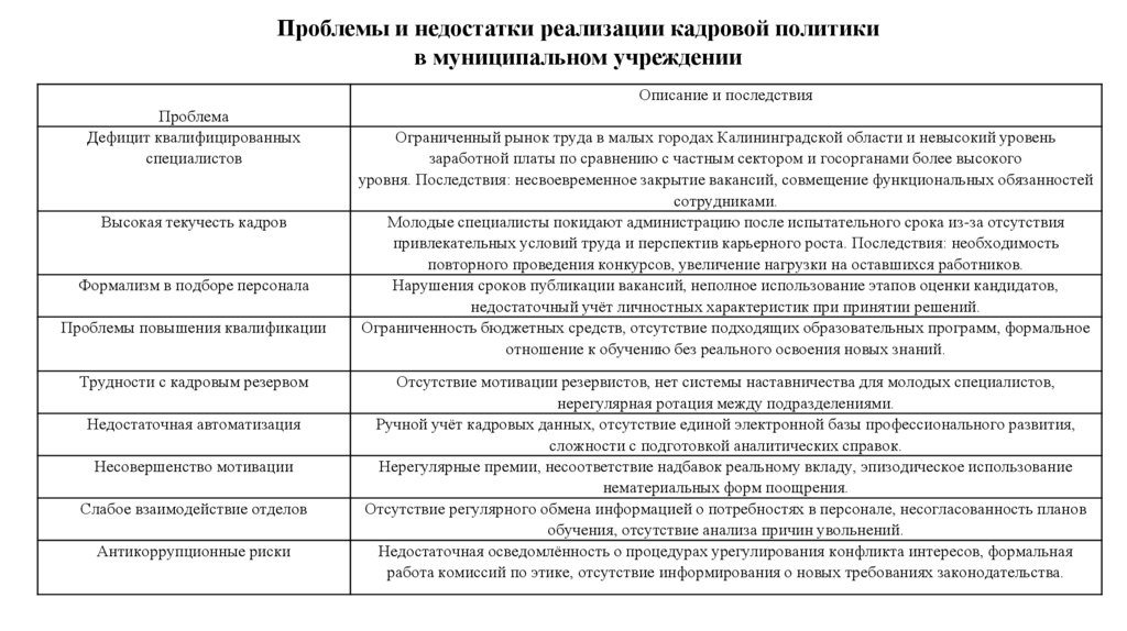выявить основные проблемы и недостатки реализации кадровой политики;