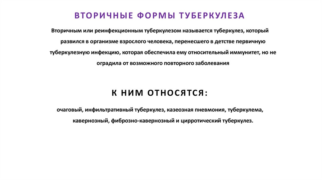 ВТО Р И Ч Н Ы Е Ф О Р М Ы Т У Б Е Р К УЛ Е ЗАВторичным или реинфекционным туберкулезом называется туберкулез, который