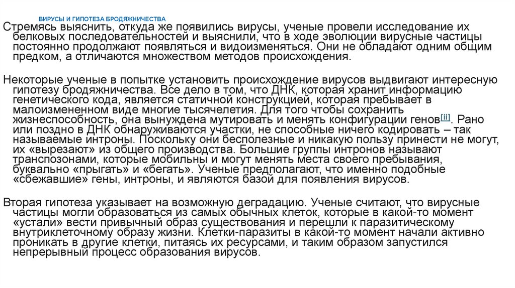 ВИРУСЫ И ГИПОТЕЗА БРОДЯЖНИЧЕСТВАСтремясь выяснить, откуда же появились вирусы, ученые провели исследование их