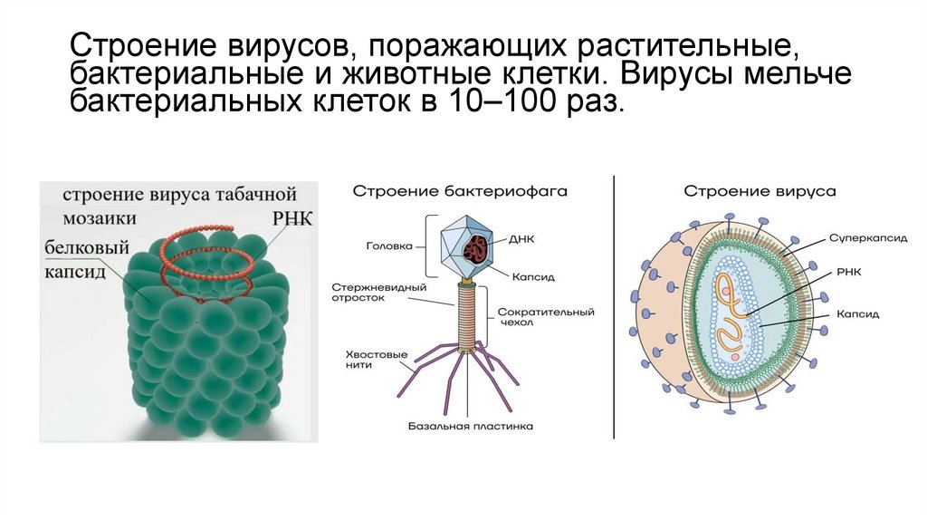 Строение вирусов, поражающих растительные,бактериальные и животные клетки. Вирусы мельче