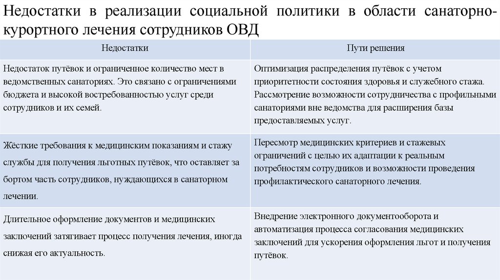 Недостатки в реализации социальной политики в области санаторнокурортного лечения сотрудников ОВДНедостатки