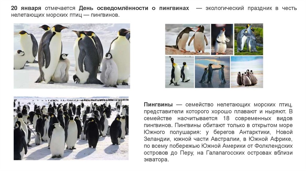20 января отмечается День осведомлённости о пингвинахнелетающих морских птиц — пингвинов.