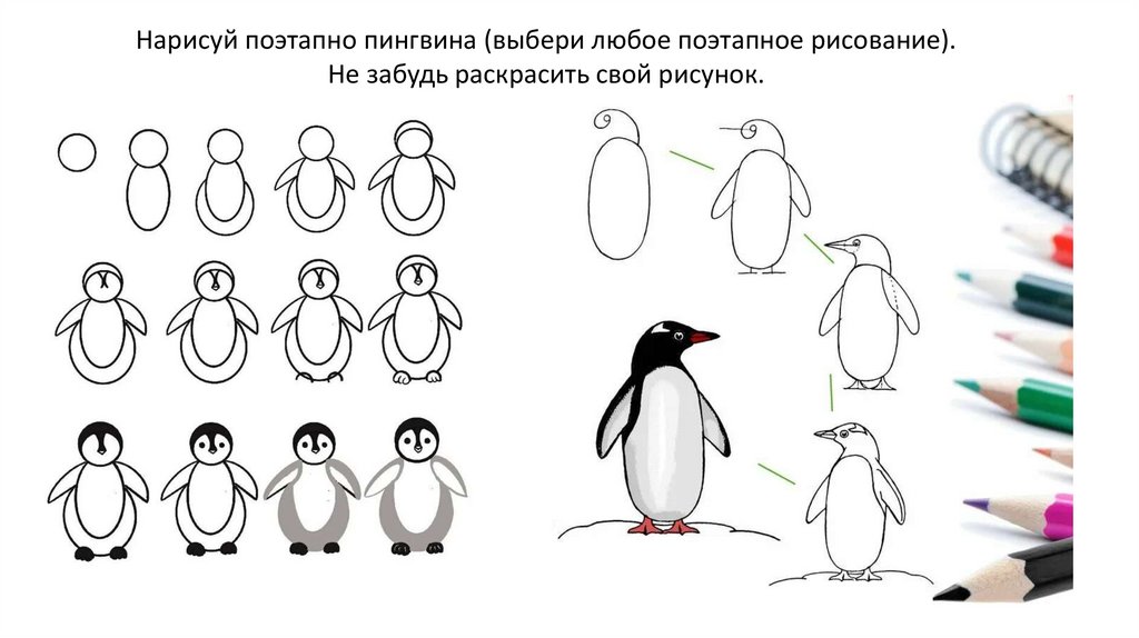 Нарисуй поэтапно пингвина (выбери любое поэтапное рисование).Не забудь раскрасить свой рисунок.