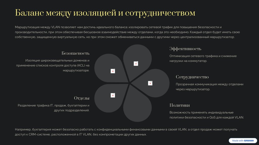 Баланс между изоляцией и сотрудничествомМаршрутизация между VLAN позволяет нам достичь идеального баланса: изолировать сетевой трафик для повышения безопасности и