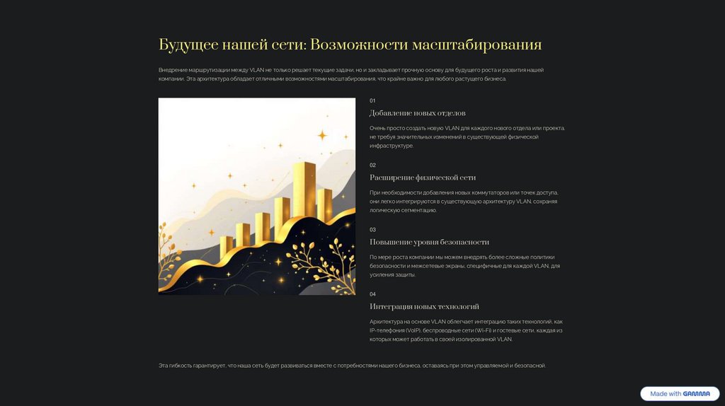 Будущее нашей сети: Возможности масштабированияВнедрение маршрутизации между VLAN не только решает текущие задачи, но и закладывает прочную основу для будущего роста и развития нашей