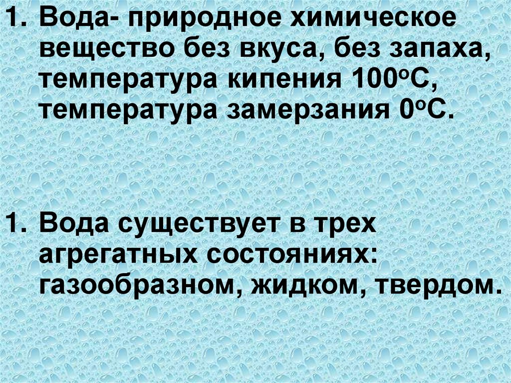 1. Вода- природное химическоевещество без вкуса, без запаха,