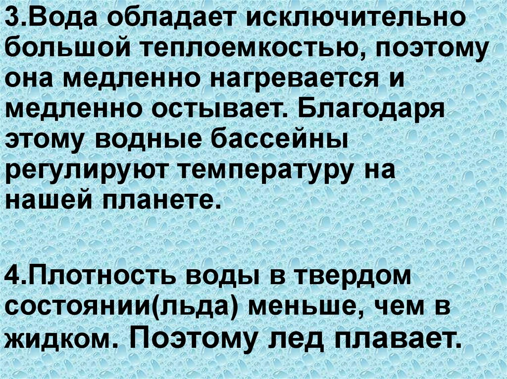 3.Вода обладает исключительнобольшой теплоемкостью, поэтому