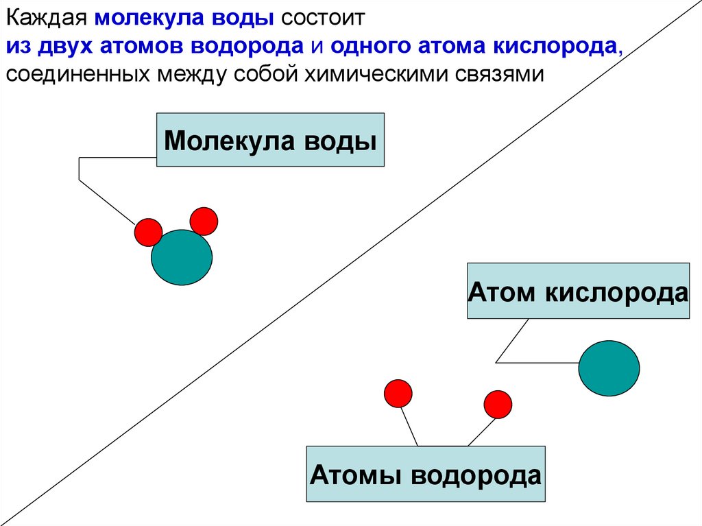 Каждая молекула воды состоитиз двух атомов водорода и одного атома кислорода,