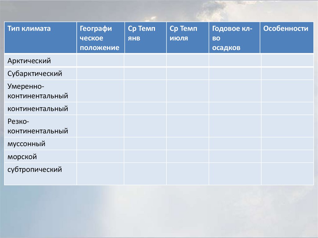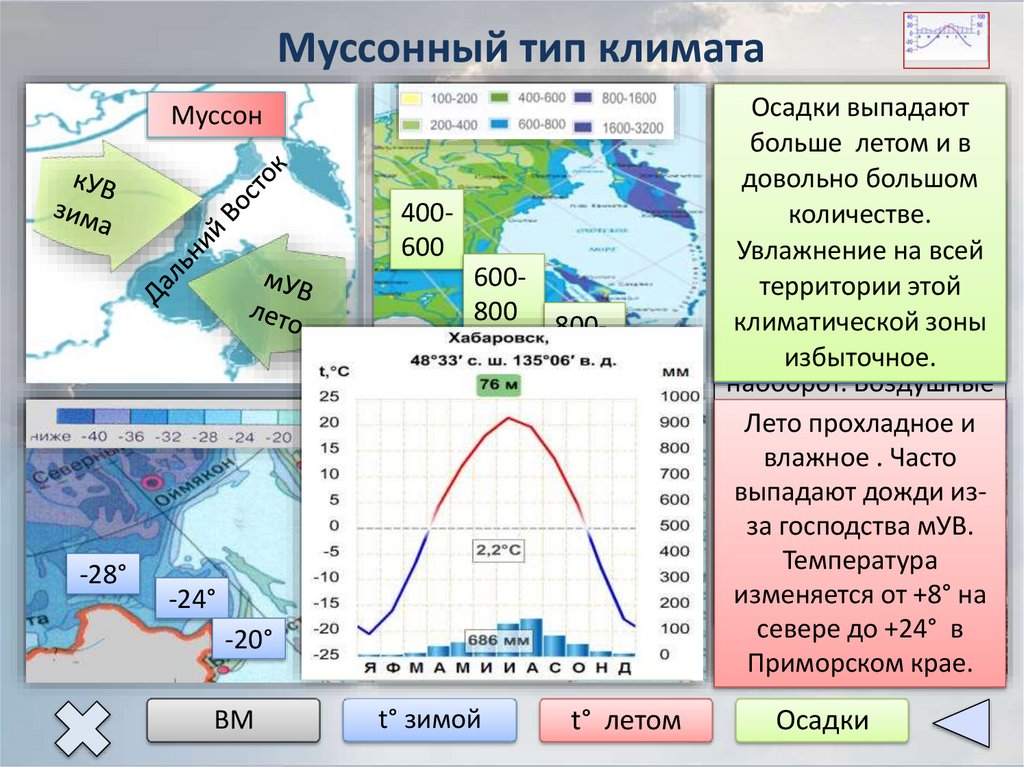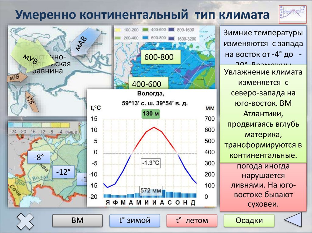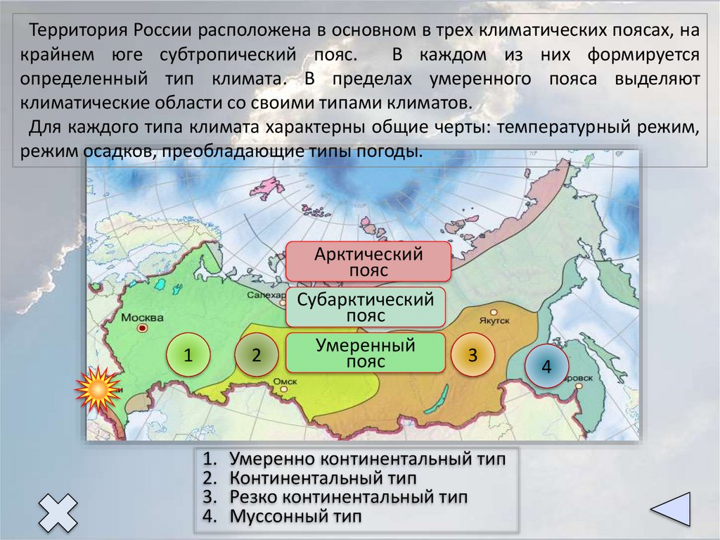 Территория России расположена в основном в трех климатических поясах, накрайнем юге субтропический пояс.