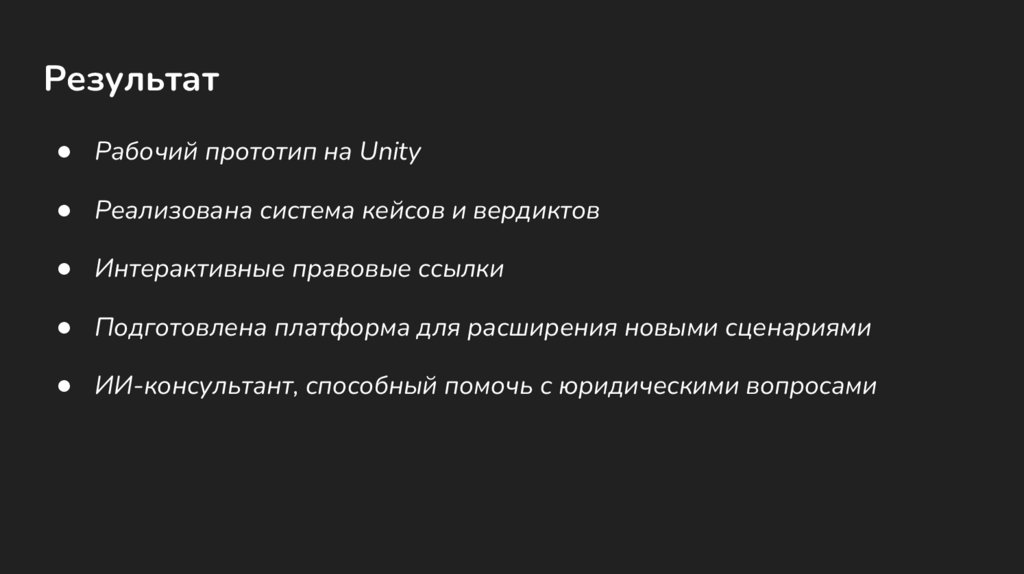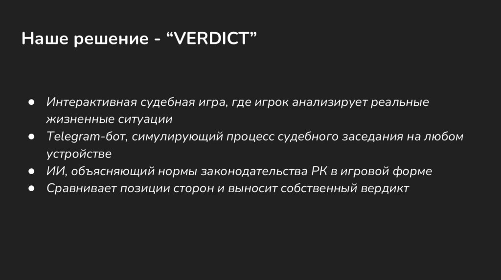 Наше решение - “VERDICT”● Интерактивная судебная игра, где игрок анализирует реальные