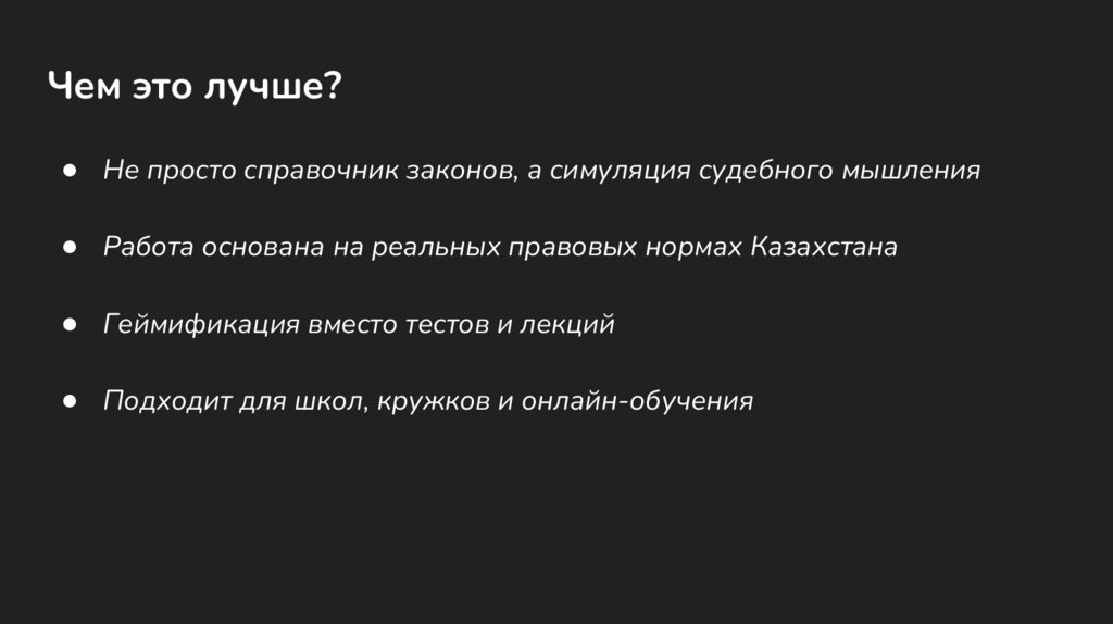 Чем это лучше?● Не просто справочник законов, а симуляция судебного мышления