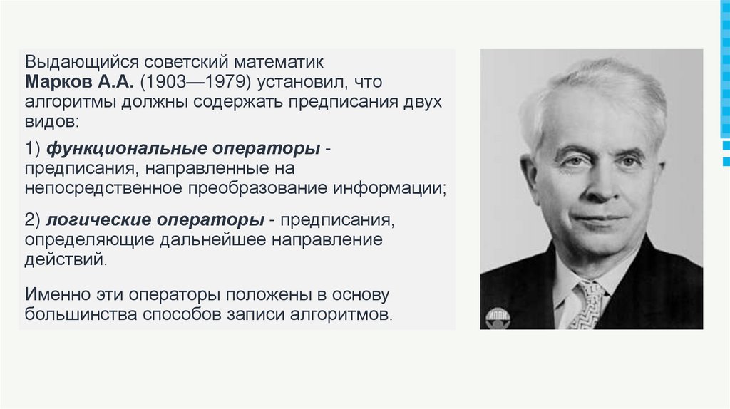 Выдающийся советский математикМарков А.А. (1903—1979) установил, что