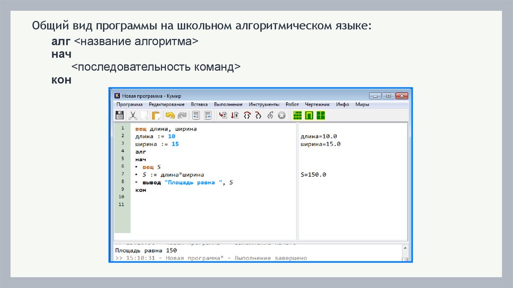 Общий вид программы на школьном алгоритмическом языке:алг <название алгоритма>