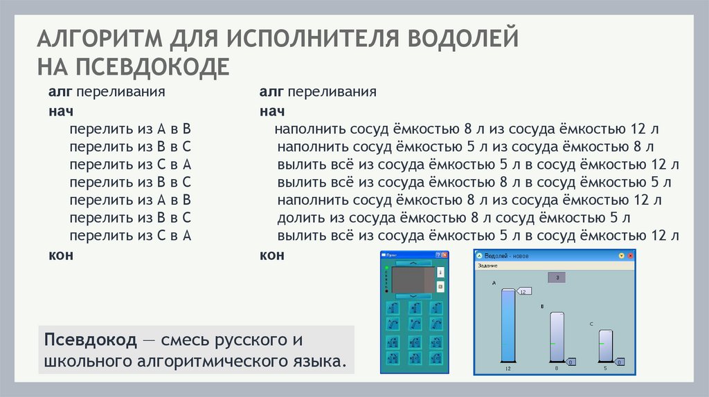 АЛГОРИТМ ДЛЯ ИСПОЛНИТЕЛЯ ВОДОЛЕЙНА ПСЕВДОКОДЕ