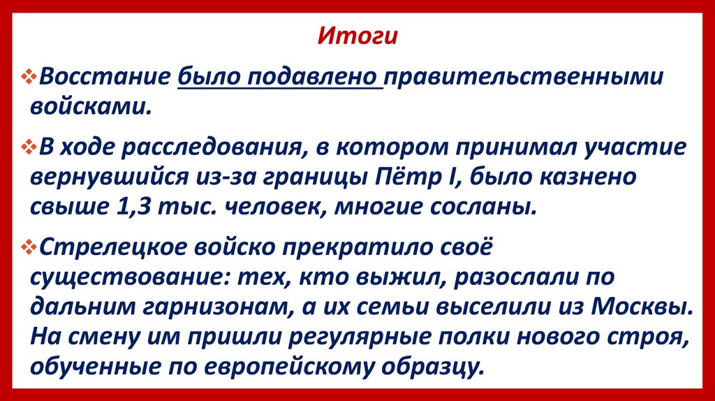 ИтогиВосстание было подавлено правительственными