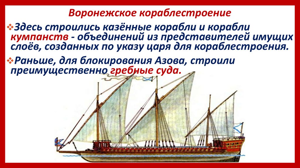 Воронежское кораблестроениеЗдесь строились казённые корабли и корабли