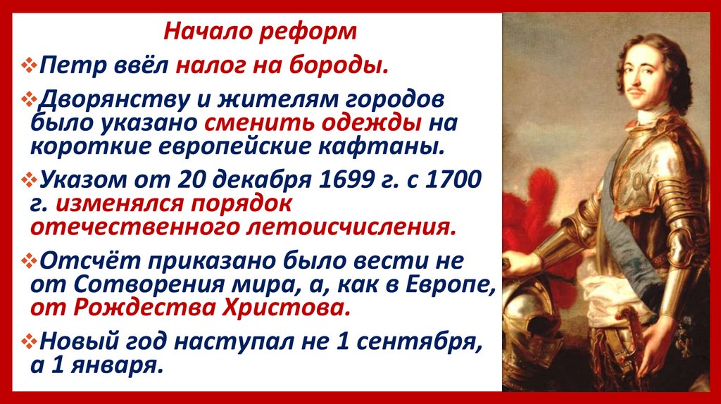 Начало реформПетр ввёл налог на бороды.