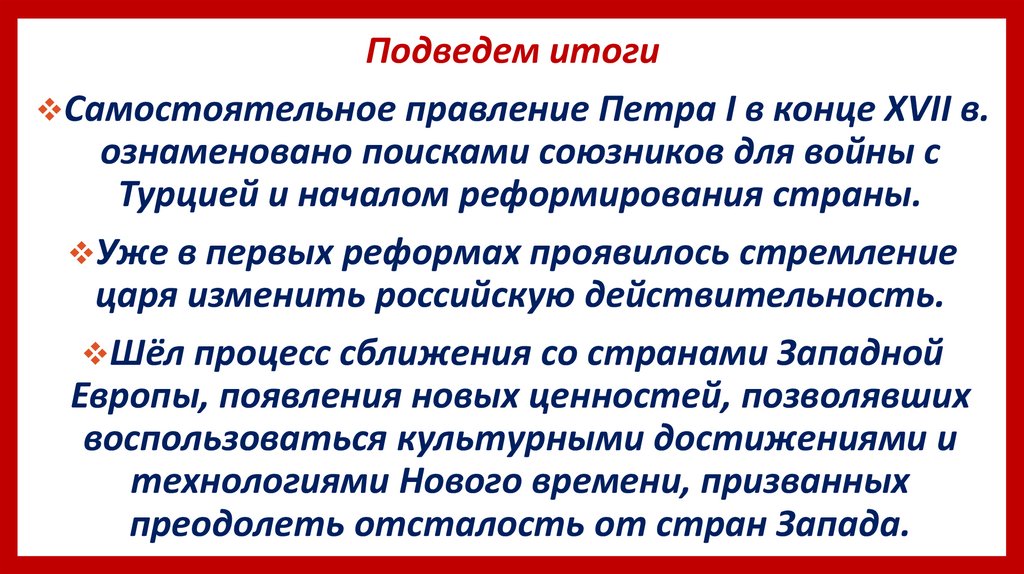 Подведем итогиСамостоятельное правление Петра I в конце XVII в.