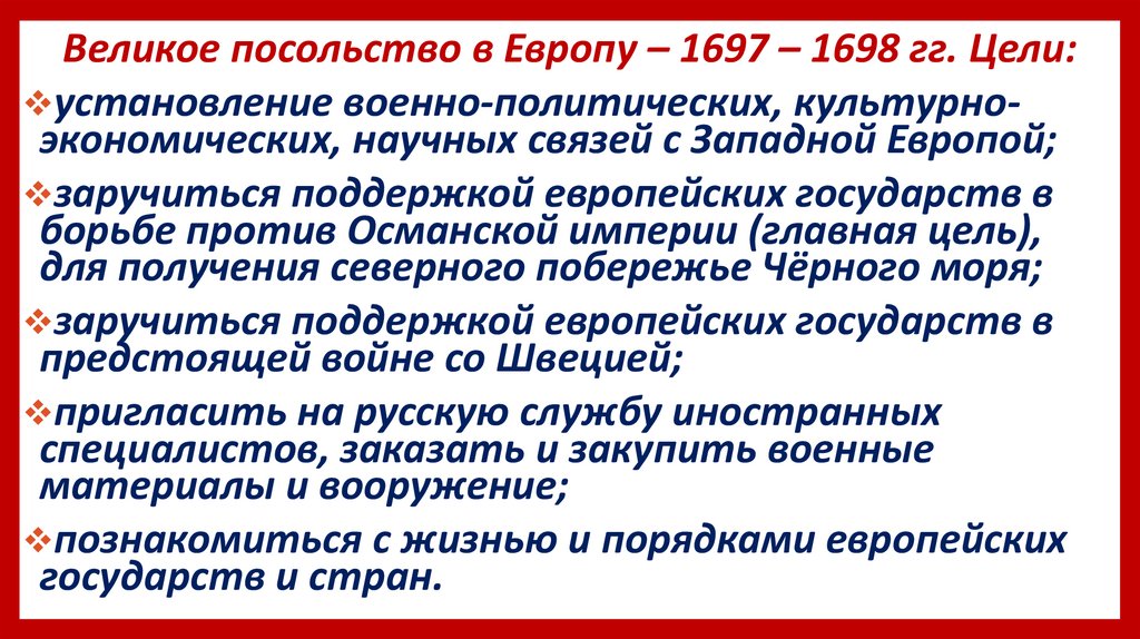 Великое посольство в Европу – 1697 – 1698 гг. Цели:установление военно-политических, культурноэкономических, научных связей с Западной Европой;