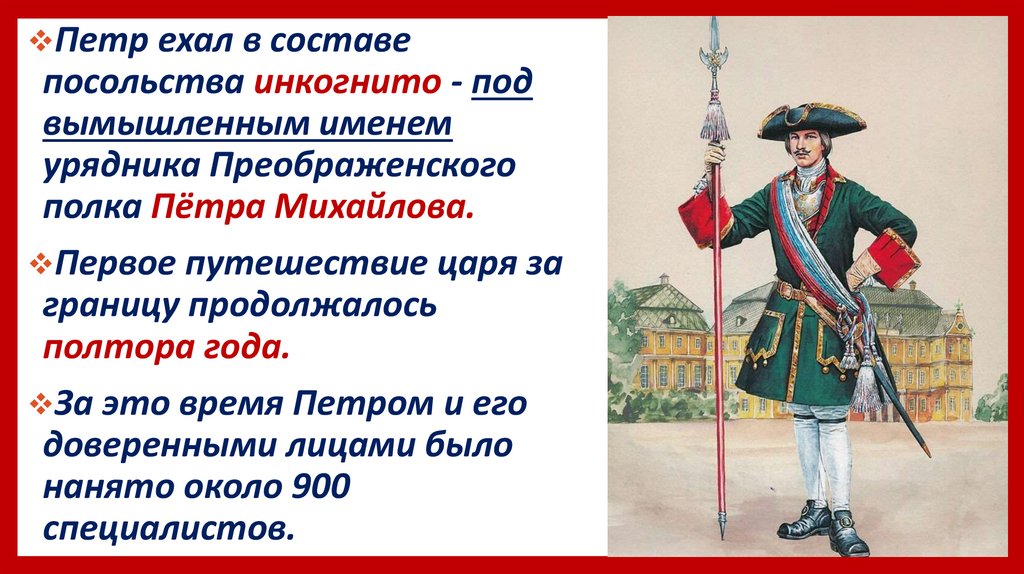 Петр ехал в составепосольства инкогнито - под
