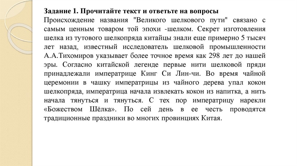 Задание 1. Прочитайте текст и ответьте на вопросыПроисхождение названия "Великого шелкового пути" связано с