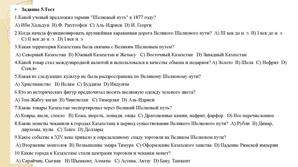 ответ.1. Великий шёлковый путь был назван так немецким учёным Ф. Рихтгофеном в 1877 году.