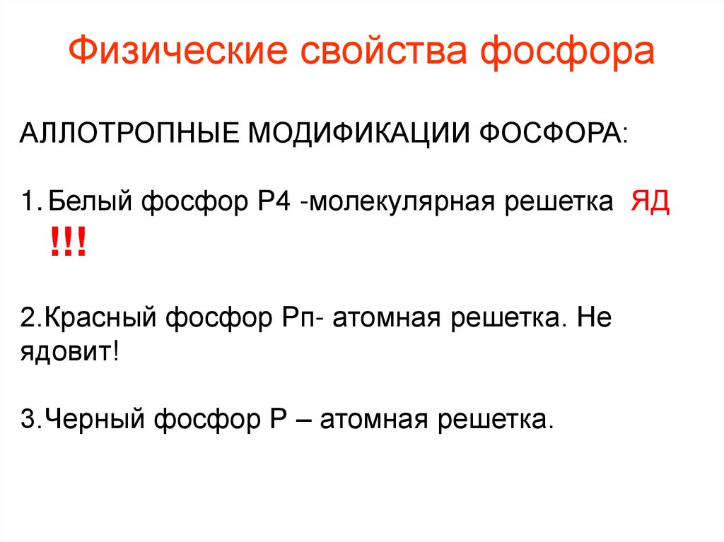 Физические свойства фосфораАЛЛОТРОПНЫЕ МОДИФИКАЦИИ ФОСФОРА: