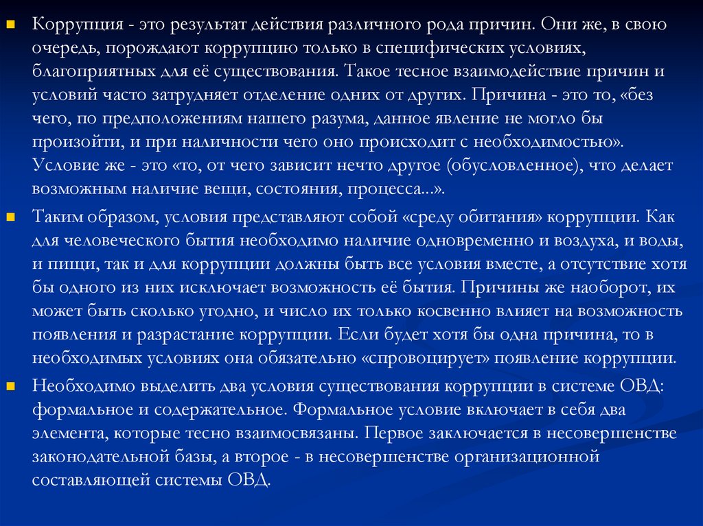 Таким образом, условия представляют собой «среду обитания» коррупции. Как