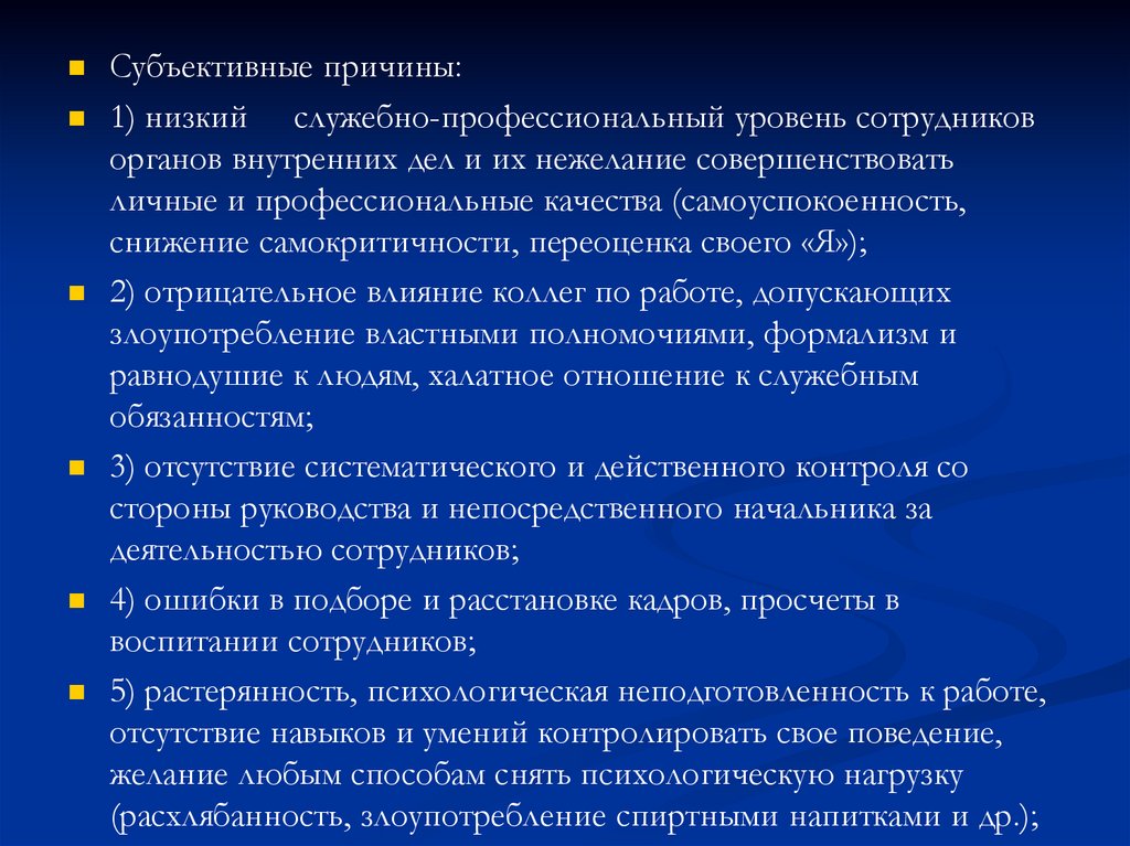 Субъективные причины:1) низкий служебно-профессиональный уровень сотрудников