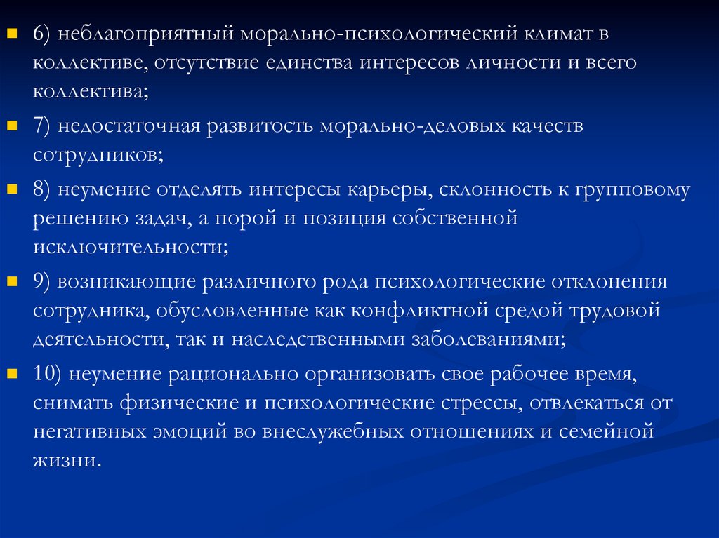 6) неблагоприятный морально-психологический климат вколлективе, отсутствие единства интересов личности и всего