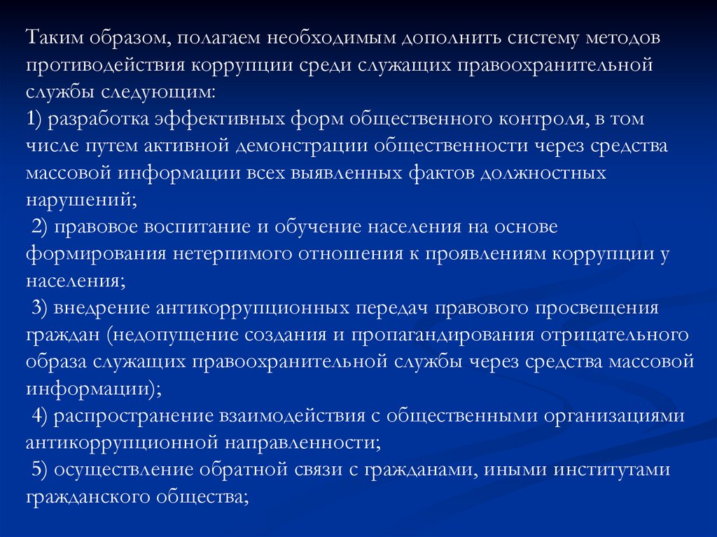 Таким образом, полагаем необходимым дополнить систему методовпротиводействия коррупции среди служащих правоохранительной