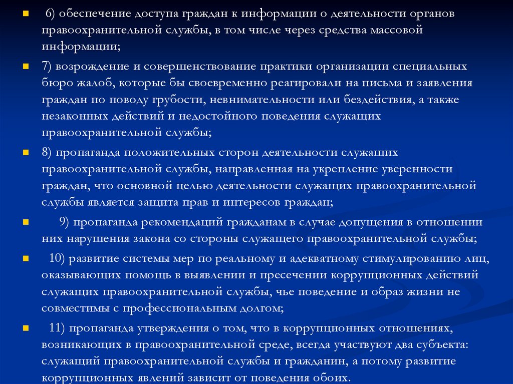 6) обеспечение доступа граждан к информации о деятельности органовправоохранительной службы, в том числе через средства массовой
