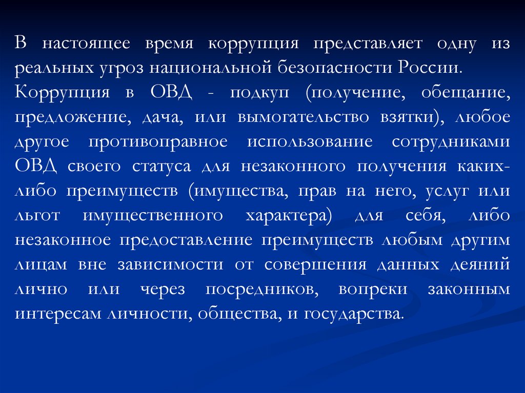 В настоящее время коррупция представляет одну изреальных угроз национальной безопасности России.