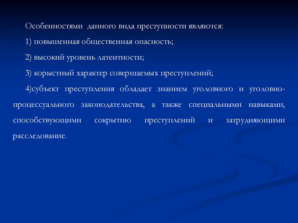 Особенностями данного вида преступности являются:1) повышенная общественная опасность;