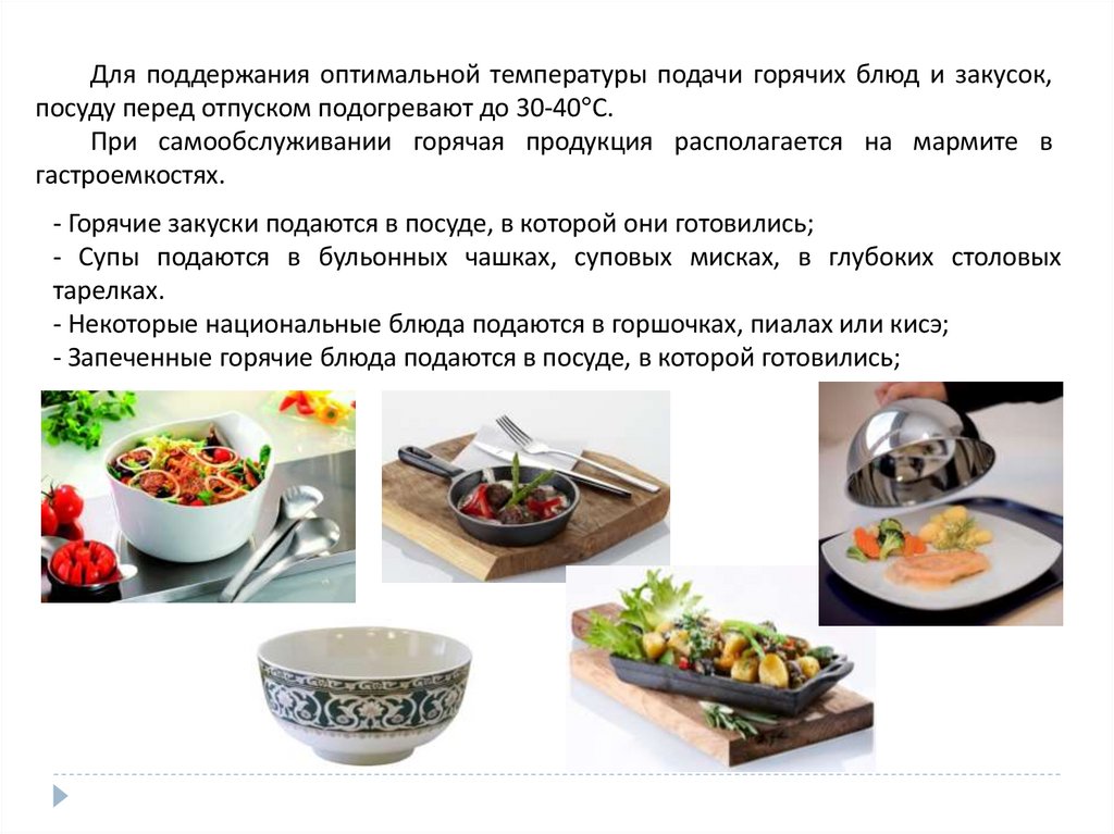 - Горячие закуски подаются в посуде, в которой они готовились;