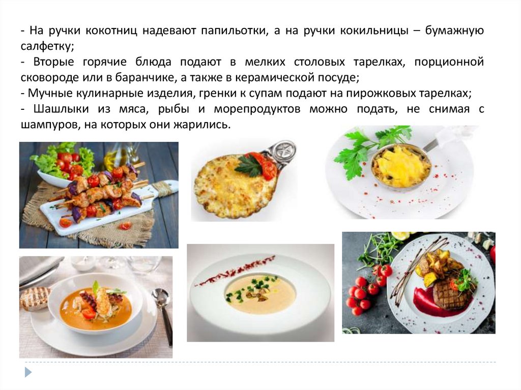 - Вторые горячие блюда подают в мелких столовых тарелках, порционной