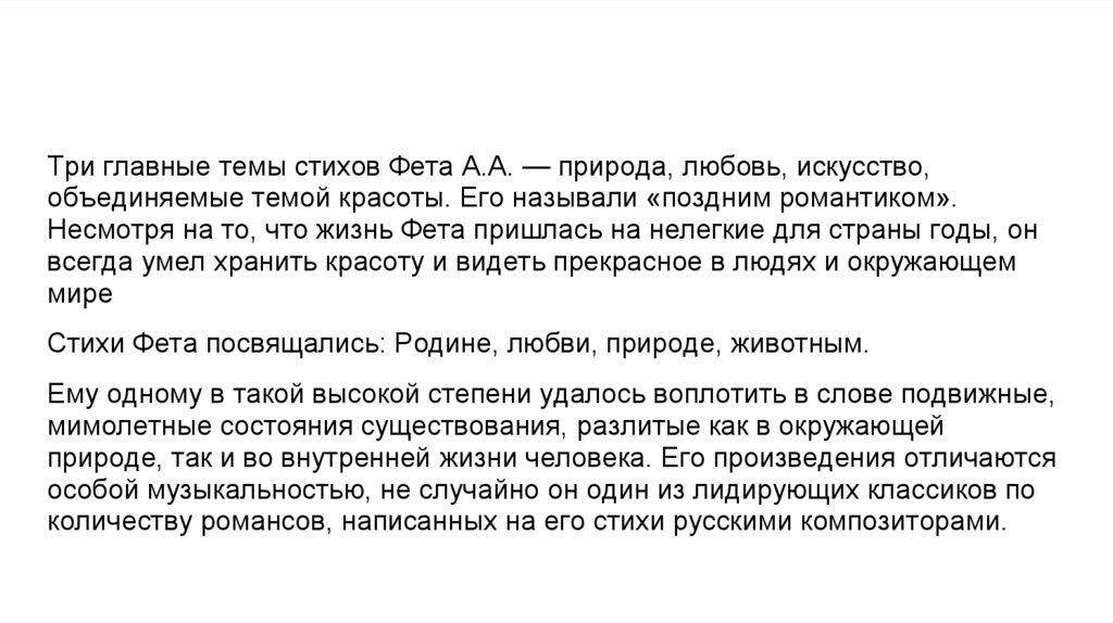 Три главные темы стихов Фета А.А. — природа, любовь, искусство,объединяемые темой красоты. Его называли «поздним романтиком».