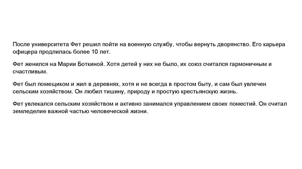 Стихи Фета известны во всем мире. А.А. Фет также был переводчиком, мемуаристом, членомкорреспондентом Петербургской Академии Наук.