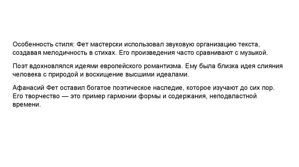 Особенность стиля: Фет мастерски использовал звуковую организацию текста,создавая мелодичность в стихах. Его произведения часто сравнивают с музыкой.