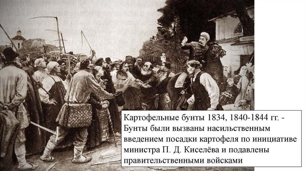 Картофельные бунты 1834, 1840-1844 гг. Бунты были вызваны насильственнымвведением посадки картофеля по инициативе