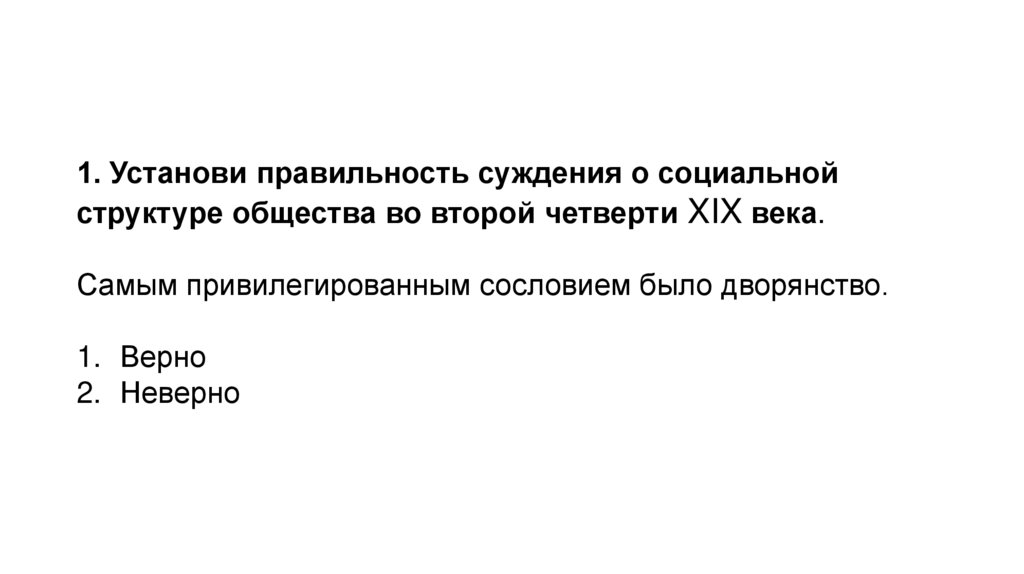 1. Установи правильность суждения о социальнойструктуре общества во второй четверти XIX века.