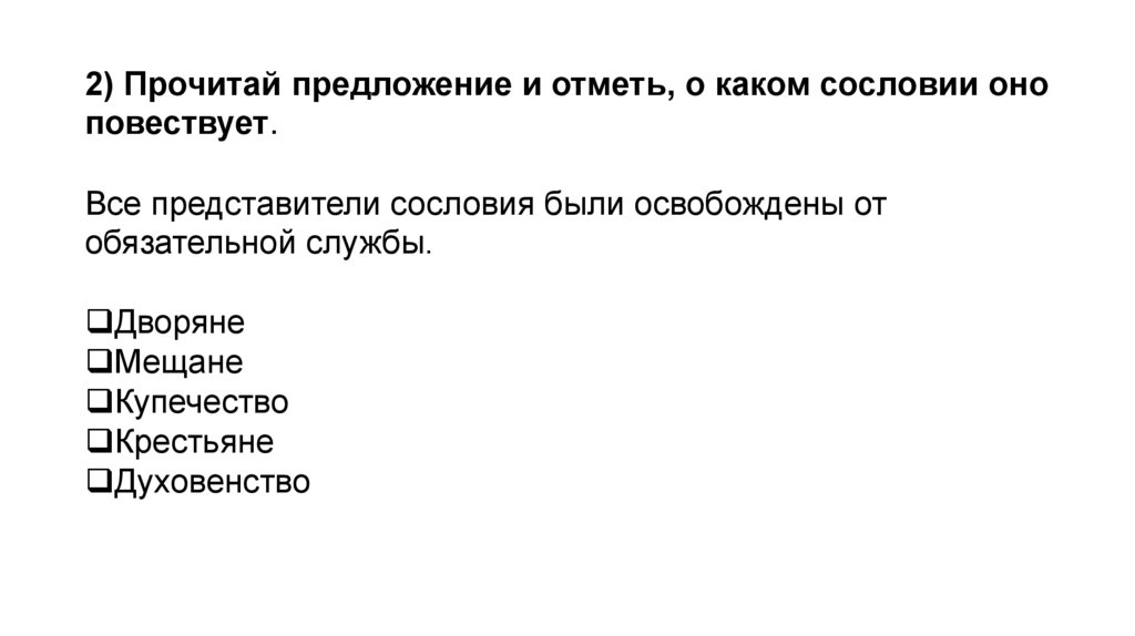2) Прочитай предложение и отметь, о каком сословии оноповествует.