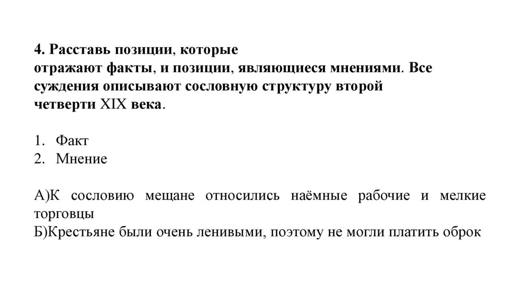 4. Расставь позиции, которыеотражают факты, и позиции, являющиеся мнениями. Все