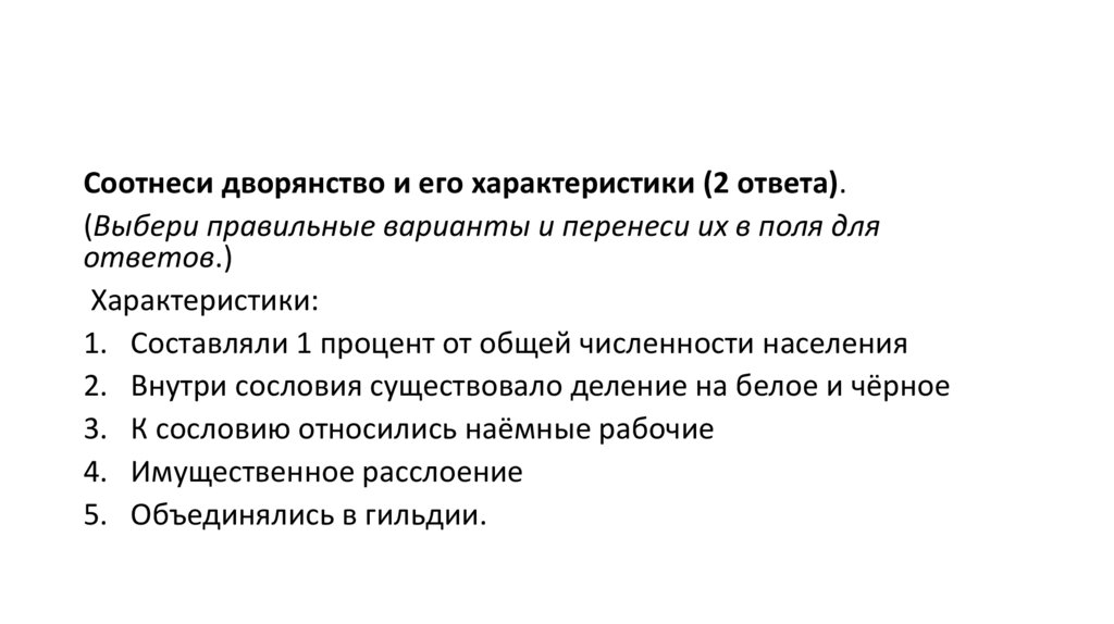 Соотнеси дворянство и его характеристики (2 ответа).(Выбери правильные варианты и перенеси иx в поля для