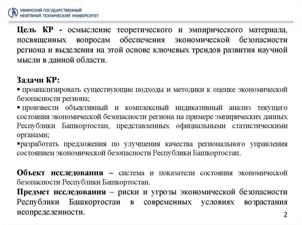Цель КР - осмысление теоретического и эмпирического материала,посвященных вопросам обеспечения экономической безопасности
