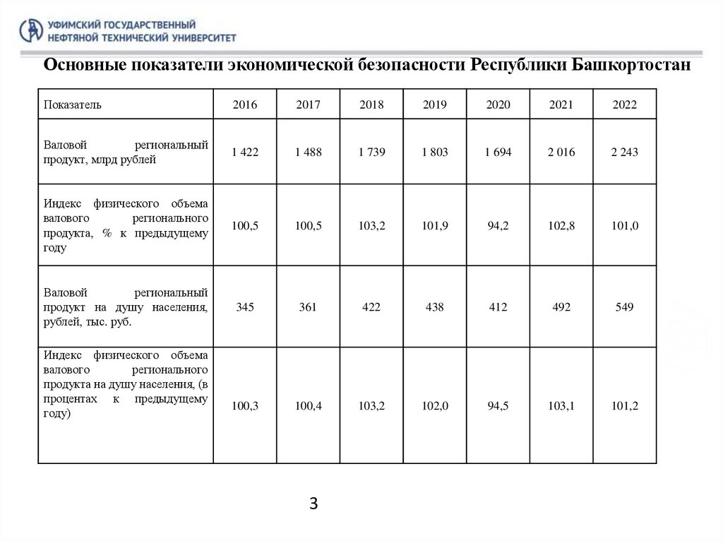 Основные показатели экономической безопасности Республики БашкортостанПоказатель