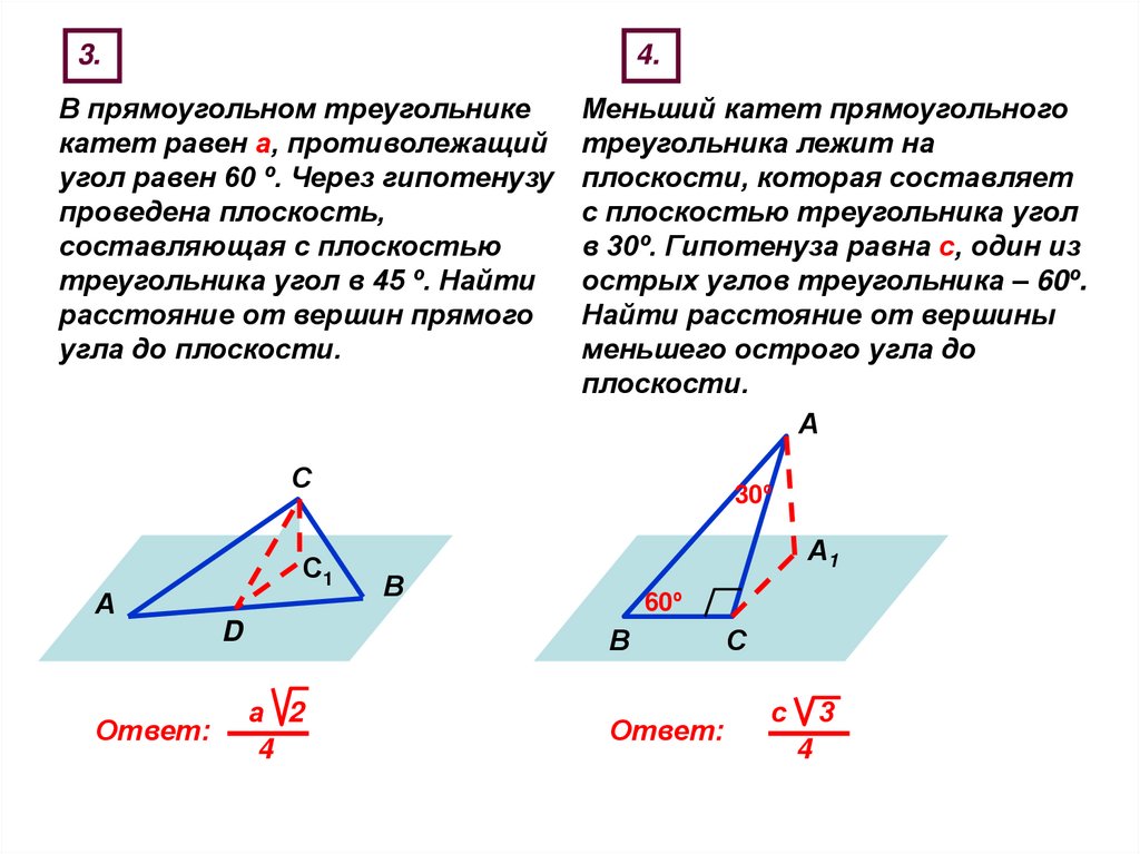 – прямоугольный, С =90º; равносторонний; прямоугольный, А=90º