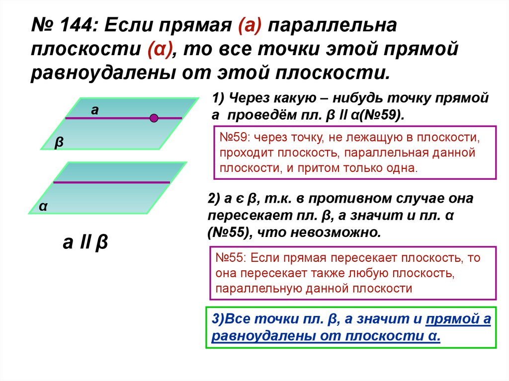№ 144: Если прямая (а) параллельнаплоскости (α), то все точки этой прямой