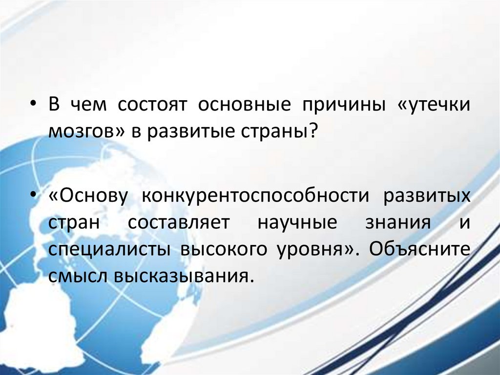 • В чем состоят основные причины «утечкимозгов» в развитые страны?