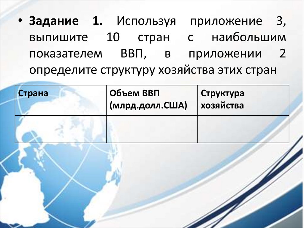 • Задание 1. Используя приложение 3,выпишите 10 стран с наибольшим